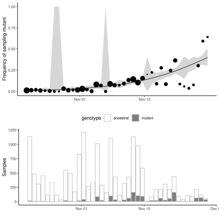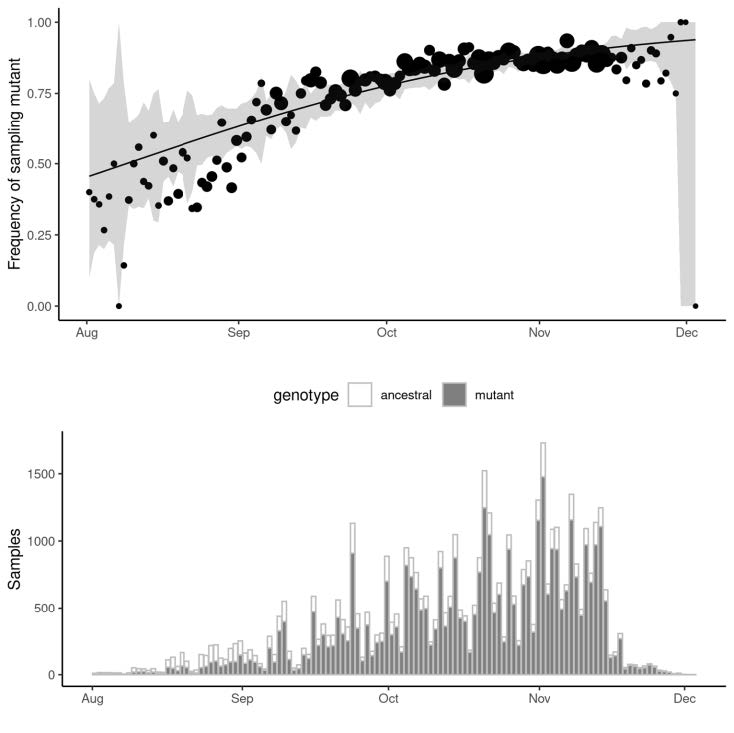 ● Frequency of VUI in sequences from Pillar 2 sampling has increased exponentially since late November ● Change in frequency consistent with but not indicative of a constant selective advantage of VUI ● Logistic growth model indicates VUI grows +71% (95%CI: 67%-75%) faster per generation (6.5 days) ○ Limitations: Sample frequency is noisy & overdispersed in ways not captured by this model |